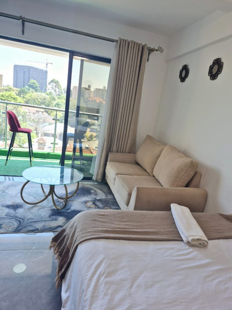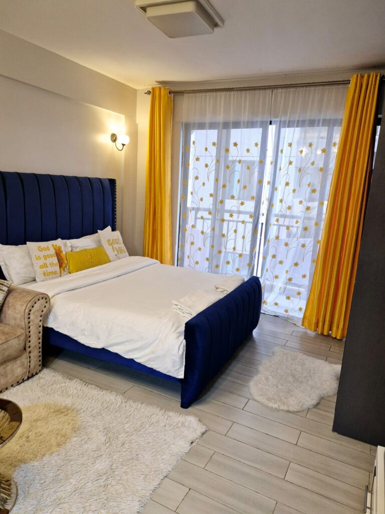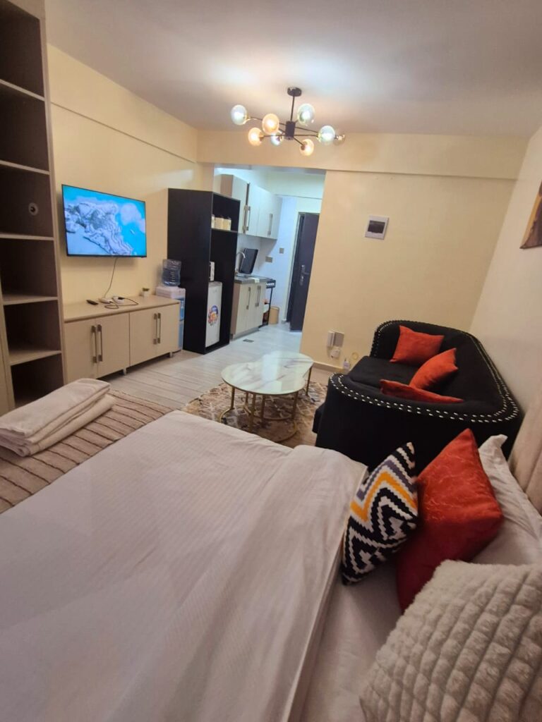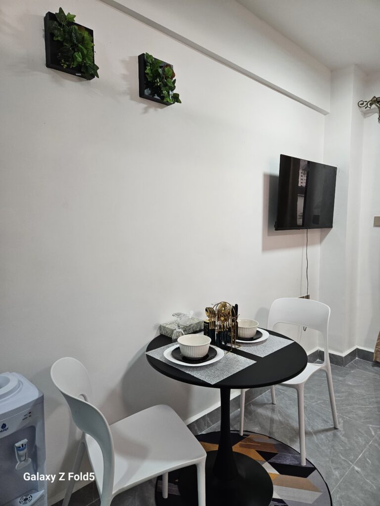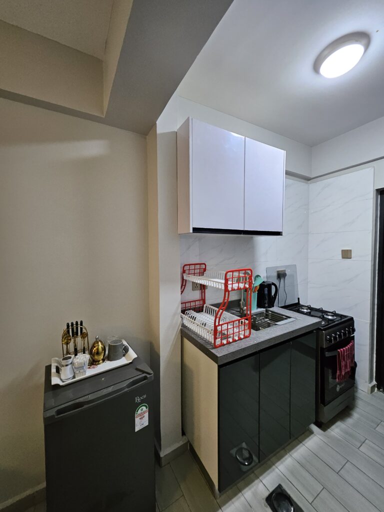 Designed with travelers in mind, our studio apartments combine practicality and style. Enjoy a peaceful night’s sleep, whip up your favorite meals in the kitchenette, and get work done in a comfy space that adapts to your pace. Whether you’re exploring Nairobi or checking in for work, you’ll love the freedom and comfort.